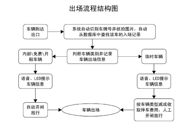 出口控制部分:快速道閘、高清車牌識別一體機(帶控制功能)、信息顯示屏